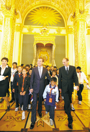 | 俄罗斯总统梅德韦杰夫(前右三)带领中国四川地震灾区学生代表参观莫斯科克里姆林宫。 新华社记者沈伯韩摄 |