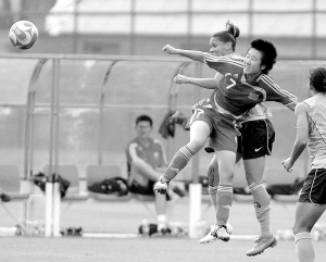 7月30日,在秦皇岛训练的中国女足与美国女足进行了一场教学赛,中国队以0比0与美国队战平。图为中国女足队员毕妍(前)与美国女足队员拼抢。 新华社发