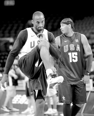 7月30日,美国国家篮球队在澳门进行训练,备战7月31日至8月2日在澳门举行的“美国男篮国际挑战赛”。图为科比(左)与安东尼在训练前热身。 新华社发