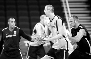 8月6日,德国男篮队员诺维茨基(右二)在对抗性训练中带球突破。 新华社发