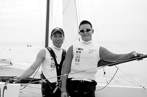 | ↓海南帆船运动员罗友佳(左)陈秀科(右),他们已抵达青岛,积极备战奥运会。