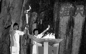 | 5月4日,三亚最后一棒火炬手由著名影星成龙和三亚天涯镇镇长蒲慧芳一同担任,图为他们在天涯海角点燃圣火盆。