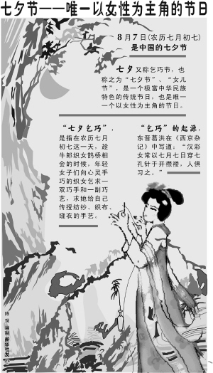 七夕源于一个凄楚动人的神话故事,说的是天上的织女与人间的牛郎互相爱慕,结为夫妻,后来却被狠心的王母娘娘拆散,二人化成牛郎星、织女星,分隔在天河两岸,只能每年农历七月初七在天河上的鹊桥相会。 今年8月7日(农历七月初七)
