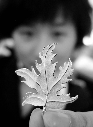 8月6日,一名工作人员在展示金叶吊坠。 为迎接中国传统的七夕节,济南一金店推出足金“金叶传情”系列饰品,受到顾客的青睐。 新华社发