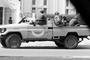 | 8月6日,毛里塔尼亚军人在首都努瓦克肖特的毛里塔尼亚电台大楼前巡逻。 新华社/法新 |