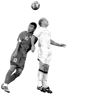 图为韩鹏(左)与新西兰国奥队球员在比赛中争顶。 新华社发 |