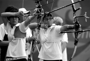 8月7日,中华台北射箭队女队员魏碧锈(右)与队友吴蕙如在训练中。〓 新华社发