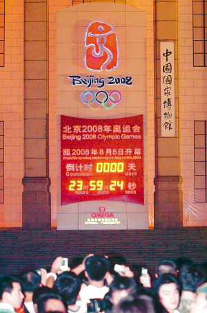 8月7日晚上8时一过,北京天安门广场东侧奥运倒计时牌上,“天”字前面的数字从“1”变成了“0”,标志着北京奥运会进入了开幕“当天”!大量市民在倒计时牌前拍摄留念。 本报特派记者 张杰 摄