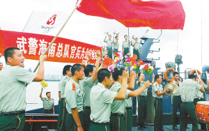 | 武警海南总队海运大队官兵敲响锣鼓为奥运加油。
