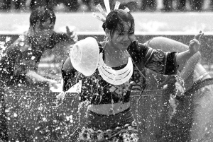8月7日,2008年中国海南七仙温泉嬉水节开幕,在保亭美丽的七仙广场上,上万名游客和黎族、苗族群众载歌载舞、互泼圣水、祈求平安、祝福奥运。 许春媚 陈耿/文 王凯/图