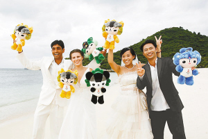 | 来自国内外的几对新人在“情人岛”上喜结良缘。图为新人手持“福娃”祝福北京奥运会。