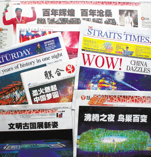 8月9日出版的新加坡《联合早报》、《海峡时报》和《今日报》以大幅照片和通栏标题报道北京奥运会开幕式,盛赞北京奥运会开幕式“光彩照人”。 新华社发