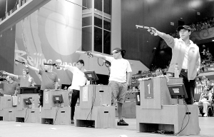 | 8月9日,在北京奥运会射击男子10米气手枪比赛中,中国选手庞伟以688.2环的成绩获得金牌。图为中国选手庞伟(右)在比赛中。
