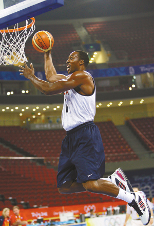 | 美国男子篮球队队员在五棵松北京奥林匹克篮球馆进行赛前训练。图为球员霍华德在训练中扣篮。 新华社发 |