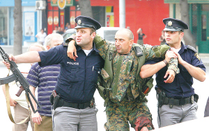 | 8月8日,在格鲁吉亚南奥塞梯州哥里市,两名警察救助在冲突中受伤的格鲁吉亚士兵。 新华社/法新 |