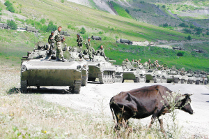 格鲁吉亚宣布 进入“战时状态” 8月9日,在俄罗斯北奥塞梯和格鲁吉亚南奥塞梯边境地区,俄罗斯士兵乘装甲车向南奥塞梯方向行进。新华社/路透