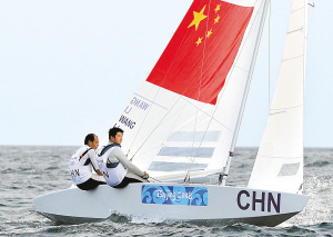 | 8月15日,第29届奥运会帆船比赛男子龙骨艇-星级进行了首轮的争夺。图为代表中国出赛的我省选手王鹤(右)和李鸿泉在星级帆船比赛中。 新华社发 |
