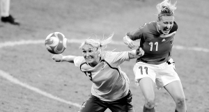 8月15日,在奥运会女子足球四分之一决赛中,德国2比0胜瑞典,携手巴西队、美国队、日本队共同挺进四强。图为德国队队员安雅·米塔格(右)与瑞典队队员弗丽达·奥斯特贝里拼抢。 新华社发