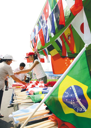 2008年8月12日,在北京朝阳公园沙滩排球比赛场馆外面,各国国旗热销。随着奥运比赛进程的进行,各国国旗深受各国啦啦队的欢迎。 本报特派记者 张杰 摄