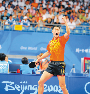 | → 8月14日,王励勤在乒乓球男团A组比赛中庆祝得分。新华社发 |