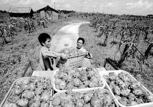 广西 8月15日,广西钦州市钦南区农民在果园内装运已收获的火龙果。广西钦州市自2000年起引进火龙果进行培育种植,现已建成火龙果种植标准化基地,种植面积已达5000多亩,年产量达到20多万公斤。目前,火龙果已成为当地农民提高收入的主要渠道。 新华社记者 张爱林 摄