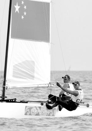 | 陈秀科、罗友佳在托纳多级帆船比赛中压舷 新华社发 |