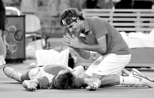 8月16日,在奥运会网球男双决赛中,瑞士选手费德勒/瓦夫林卡以3比1战胜瑞典选手阿斯佩林/约翰松。 新华社发