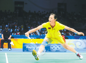 八月十六日,张宁在北京奥运会羽毛球女子单打决赛中夺得金牌。 新华社记者 罗晓光 摄 (相关报道见第十版)