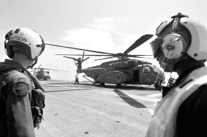 8月15日,在美国“塔拉瓦”级两栖攻击舰上,两名飞行员在甲板上待命。当日,在巴拿马附近水域举行的“2008联盟力量”联合军事演习进入第五天。此次联合军演将于本月22日结束,共有约7000名军事人员参加。 新华社/法新