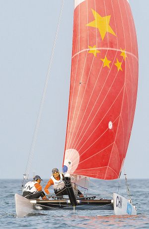 | → 18日,我省选手陈秀科、罗友佳在托纳多级帆船比赛中。