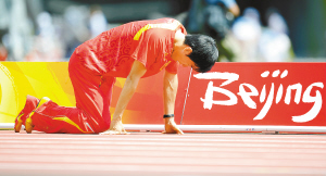 8月18日,中国选手刘翔在北京奥运会男子110米栏第一轮比赛中,因为脚跟之伤退出比赛。 新华社记者 刘大伟 摄 (更多报道见第九、十二版)