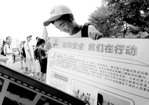8月18日,来自西安的初二学生崔海明在钱塘江边搬运防潮宣传展板。暑假期间,杭州市上城区望江街道组织了近30名外来务工人员子女参加“防潮夏令营”,召集志愿者对他们宣讲钱塘江潮水的危险性,以避免不幸发生。新华社记者 黄深钢 摄