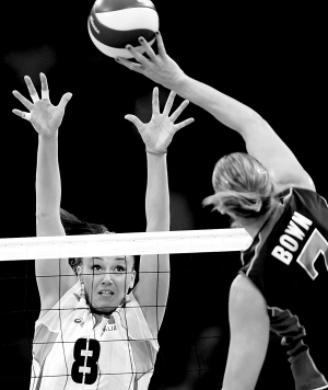 | 8月19日,在女子排球1/4决赛中,美国队以3比2战胜意大利队。图为意大利队队员詹妮·巴拉扎在拦网。