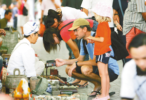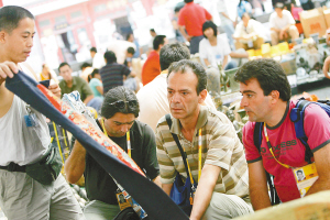 8月19日,在北京潘家园古玩市场,外国游客入乡随俗大口杀价买中国特色的古玩。借着前来北京观看奥运会的机会,大量的外国游客通过自己的亲身体验,品味着中国的独特“味道”。 本报特派记者 张杰 摄