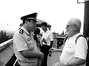一男一女两位外国游客冲着我们走了过来,还没等他们开口,刘文立已经迎上前去流利地用英语发问:“我是这儿的民警,请问有什么需要帮您?”本来还有些犹犹豫豫的这两位游客立马放松了表情,用英语回答说:“太好了,我是英国人,不会讲中文,请问我怎样才能走到公园的西门?”“哦,请跟我来……”刘文立指给他们西边的山道,一边用英语详细地做着介绍。两位游客一边摆手说“再见”,一边赞叹,“你的英文太棒了!”