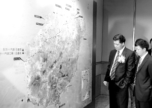 | 一批重大项目在海南(香港)经贸活动周展馆被定位在海南岛地图上。本报特派记者 王 军 摄 |