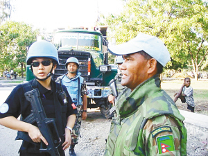 | 王健(左一)在海地街头执勤。 省边防总队三亚边防检查站提供 |