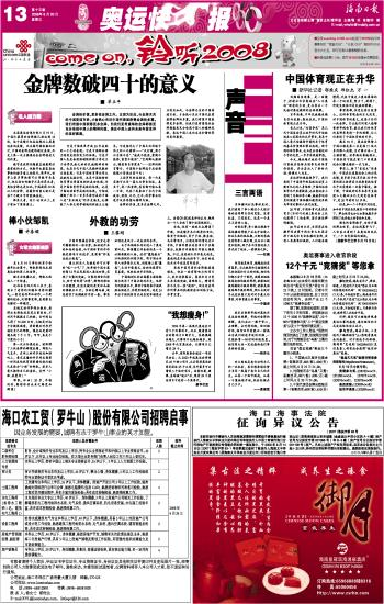 海南日报 奥运快运 013 2008-08-201 2008年08月20日 星期三
