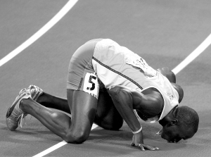 | 8月20日晚,博尔特夺得200米冠军并打破世界纪录后亲吻赛场以示庆祝。 新华社发 |