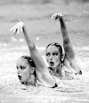 8月20日,俄罗斯选手阿纳斯塔西娅·达维多娃/阿纳斯塔西娅·叶尔马科娃在比赛中,她们在花样游泳双人项目比赛中以99.251分的总成绩获得冠军。 新华社发