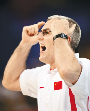 | 8月21日,在女篮半决赛中,中国队以56比90负于澳大利亚队,无缘决赛。图为中国队主教练汤姆·马赫在场边呐喊。 新华社发 |