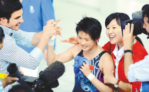 ← 8月21日,中国选手陈若琳(中)在比赛后接受加拿大跳水名将德斯帕蒂(左)的祝贺。 新华社记者 赵鹏 摄