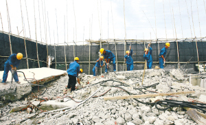 今天,在拆建现场,负责拆楼的海南琼信拆迁工程有限公司林为胜师傅告诉记者,因为该楼楼层较高,楼体结构坚硬,拆除难度较大,拆迁工人只能一层层从上往下拆,同时用人工从楼下搬运拆除下来的建筑垃圾,再用车清运走。为了保护其余合法的楼层,施工队不能用锤击机,只能用风炮机加人工锤打。拆迁工人日夜加班赶工,拆除工作比预计80天的施工期提前了20天。