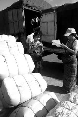 8月22日,盈江县地震应急指挥部后勤保障中心的工作人员在清点等待发往重灾区的棉被。当日,中国红十字会和云南红十字会捐赠的毛毯、棉被、帐篷、大米、药品等价值70万元的救灾物资运抵云南盈江县城,即将发往地震重灾区各乡镇及村寨。 新华社发