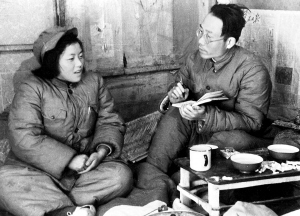 | 1952年,魏巍(右)在朝鲜三登野战医院访问志愿军模范护士罗克贤。 新华社发 |