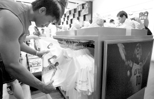 | ←8月25日,顾客在北京一家商场内选购美国男篮夺冠限量纪念T恤。8月24日,美国男子篮球队在北京奥运会男篮决赛中击败西班牙队,重夺冠军。新华社记者 王迎 摄 |