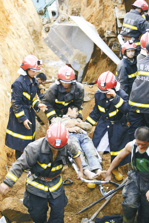 | 消防官兵将其中一名被埋工人救出。 本报记者 程范淦 摄 |