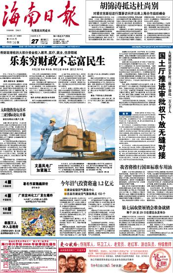 海南日报 头版 001 2008-08-271 2008年08月27日 星期三