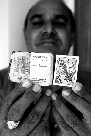 8月27日,印度教师曼代利在艾哈迈达巴德将他收藏的英国作家、戏剧家莎士比亚四大悲剧之一《麦克白》的袖珍版图书与火柴盒一同拿在手中展示。这本有315页的袖珍版《麦克白》长5厘米、宽3厘米、厚1厘米,与火柴盒大小相仿。曼代利于1975年以50印度卢比(相当于5.97美元)的价格在艾哈迈达巴德的“周日集市”上购得这本袖珍书,当时并不清楚它的潜在价值。一基金会表示愿意以20万印度卢比(相当于4564美元)的价格购买该书,然而曼代利能够接受的价格底限是100万印度卢比(相当于22820美元)。 新华社/法新