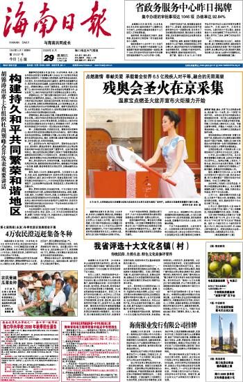 海南日报 头版 001 2008-08-291 2008年08月29日 星期五